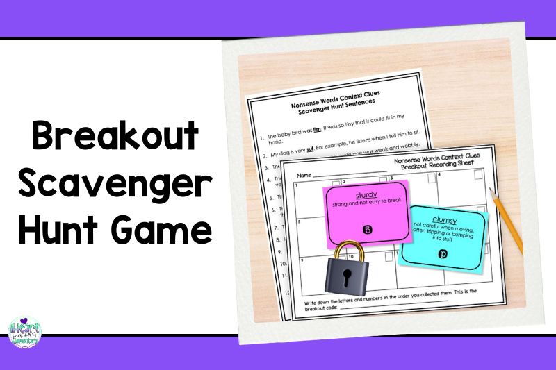 Another fun way to practice context clues is with a breakout type of scavenger hunt. Students walk around the room and figure out nonsense word meanings using context clues.